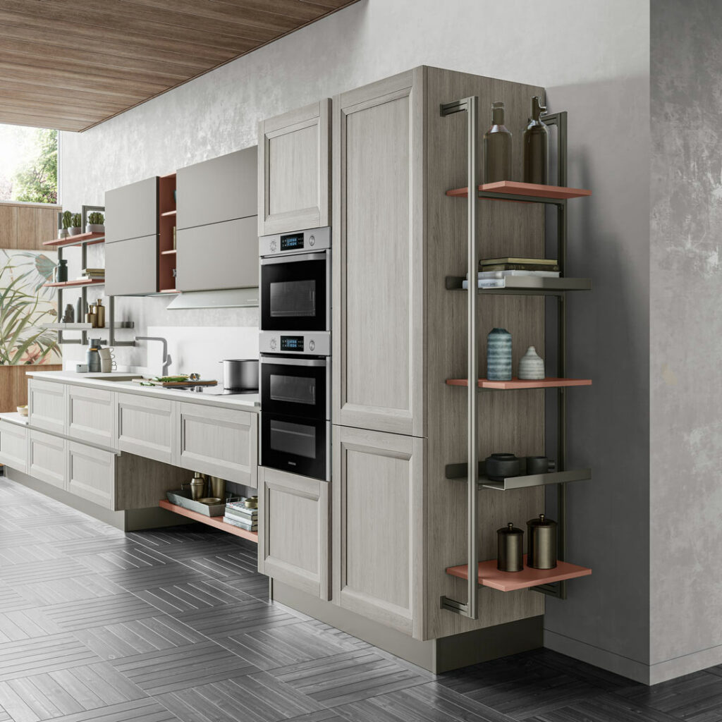 Costituiti da pannelli di particelle di legno conformi allo standard F**** e US EPA TSCA Title VI (a bassissima emissione di formaldeide) di spessore 18 mm nobilitati in melaminico. I ripiani sono di spessore 18 mm e sono dotati di reggi ripiano incorporato con dispositivo antisganciamento; essi possono essere anche in vetro temperato (spessore 6 mm) molati sui bordi.